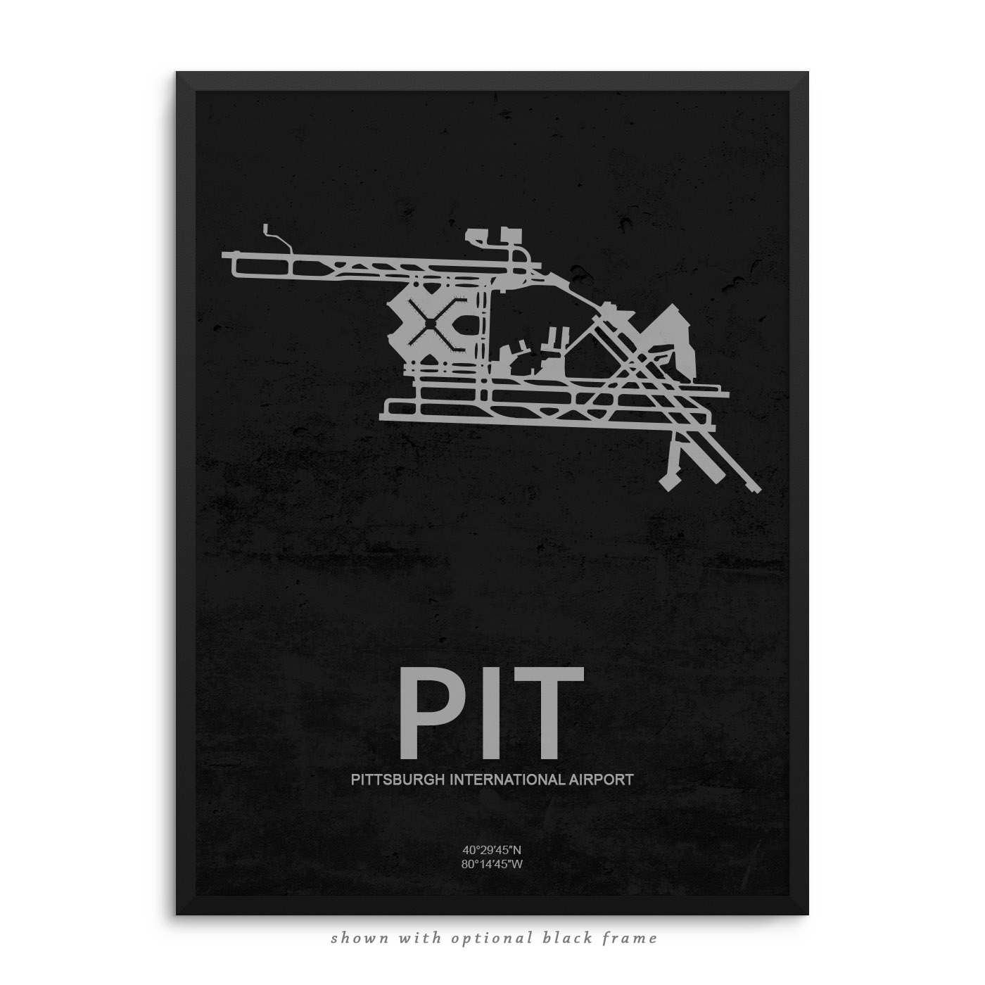 Pittsburgh International Airport art print with the airport code PIT – this airport themed wall decor is available in different sizes and with or without a frame.